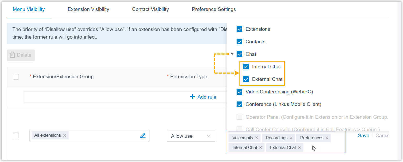 - Optimized Menu Visibility permission for Cloud Voice App clients: Added support for granular control to Chat, allowing you to specify whether extension users have access to internal chat and external chat.