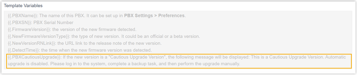 {{.PBXCautiousUpgrade}}, which will display a notification prompting you to back up data and perform a manual upgrade if the detected new version is a caution upgrade version.