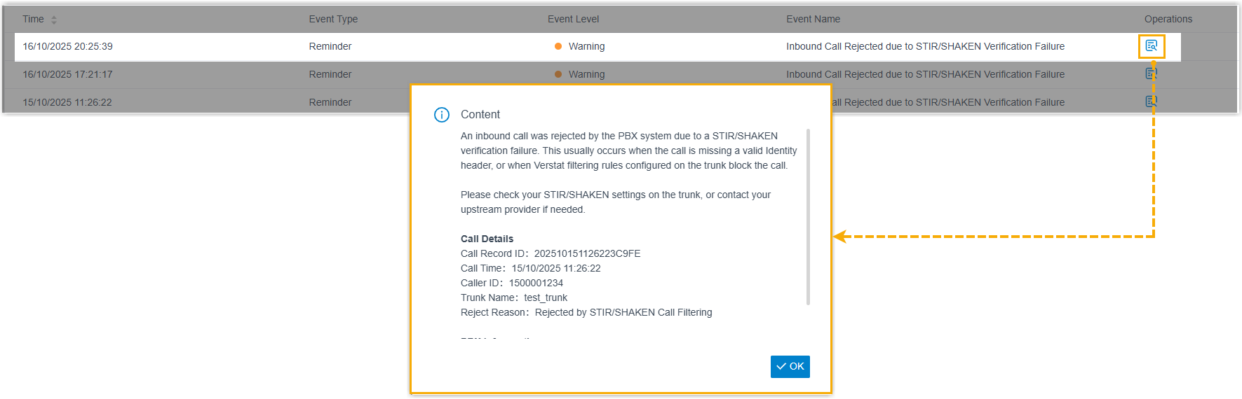 Event notifications When an inbound call is rejected due to STIR/SHAKEN authentication issue, PBX will send an event notification Inbound Call Rejected due to STIR/SHAKEN Verification Failure to notify the specified contacts.