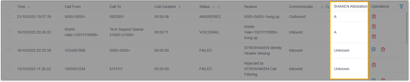 Tip: You can view the related STIR/SHAKEN feature settings on . For more information about these settings, see SIP Trunk Settings.Verification records PBX will record the verification result (signature status or attestation level) for each call in the Call Detail Record (CDR).