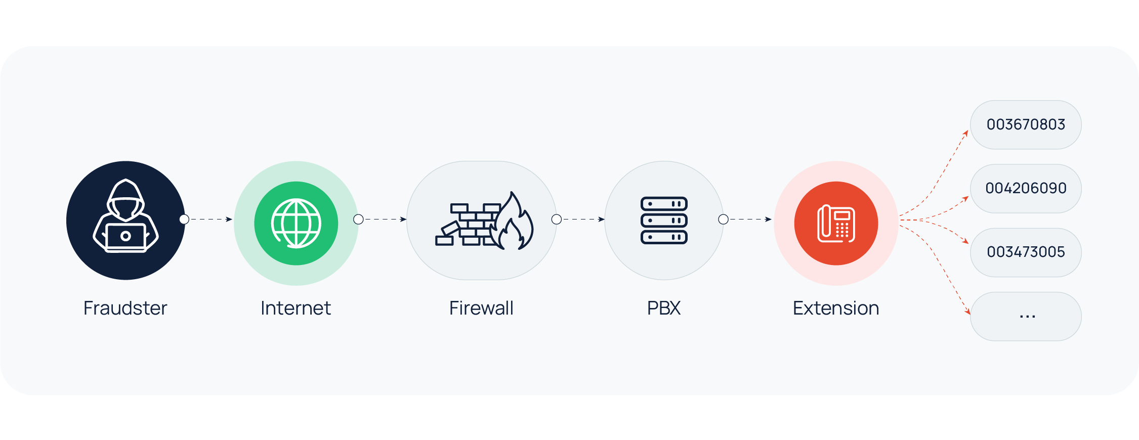 Typically, fraudsters use vulnerability scanners to crawl the Internet looking for vulnerabilities in your company's firewalls (like open ports). If any open port is detected, the fraudsters may punch requests at the port in order to tease out information about system vulnerabilities. In the end, they may have all the information they need to brute force their way through the firewall. Once the firewall has been breached, the fraudsters can gain access to the PBX, build a back door into the system, and use it to route as much traffic as they want, eventually leading to toll fraud.