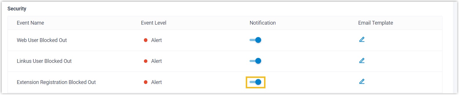 Cloud Voice has a built-in account lockout policy to prevent unauthorized access to extension accounts. It automatically locks the risky accounts after a certain number of failed registration attempts from the same IP address. When an account is locked, the PBX will block the source IP address, display it in Blocked IPs, and send an Extension Registration Blocked Out notification to the specified contacts.